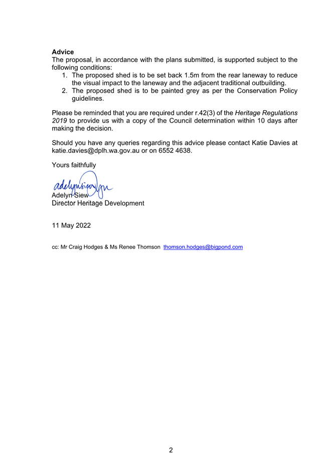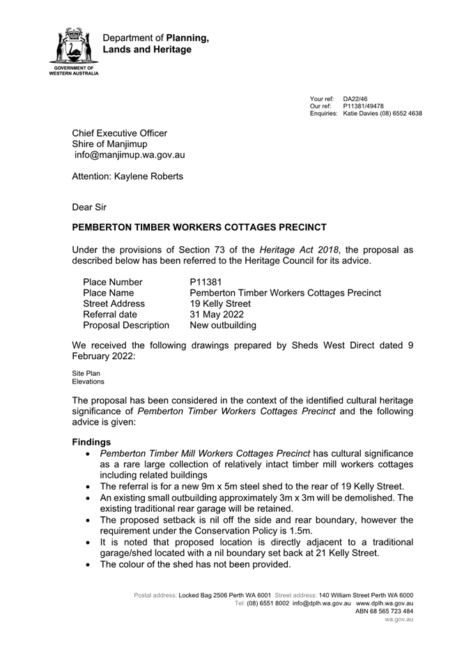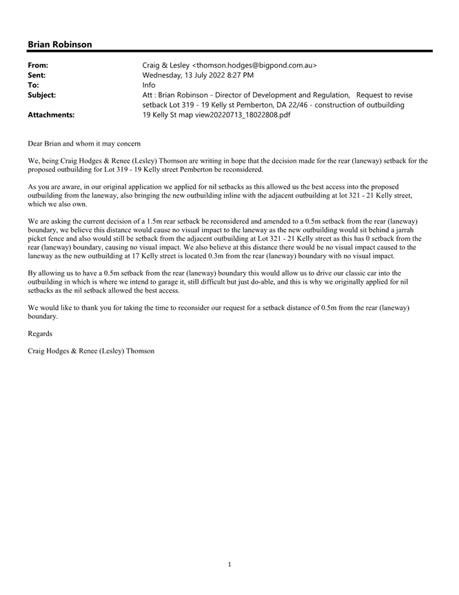 9.5.6 - Request for Reconsideration of Rear Setback - Proposed Outbuilding at No 19 (Lot 319) Kelly Street, Pemberton