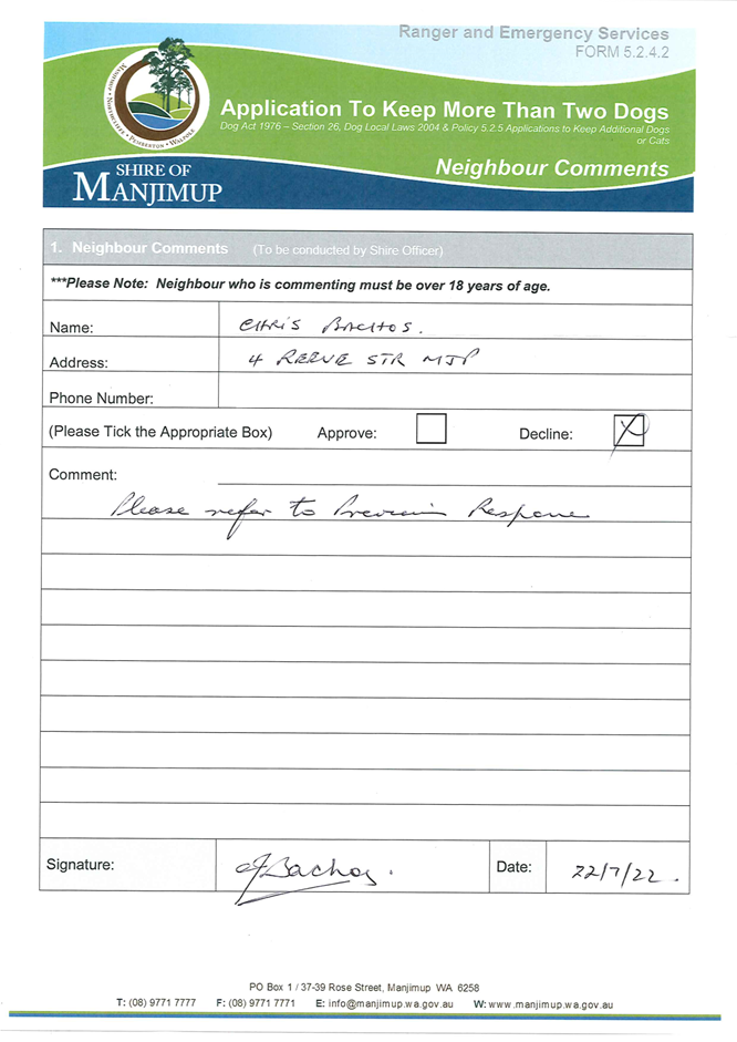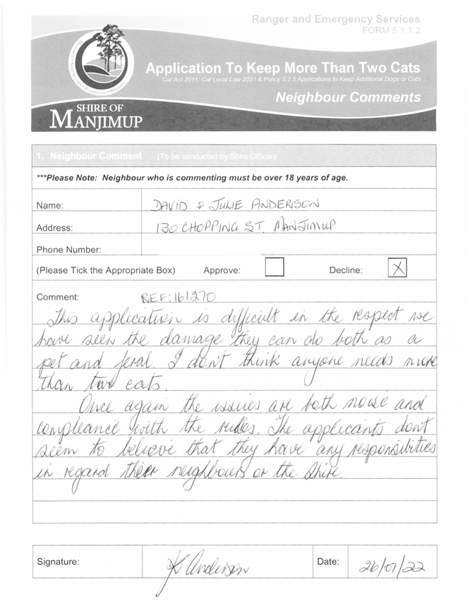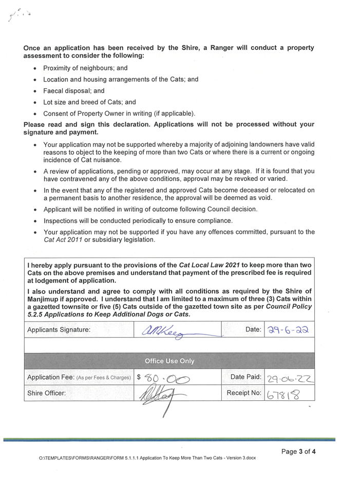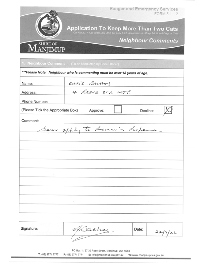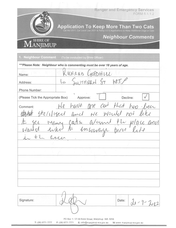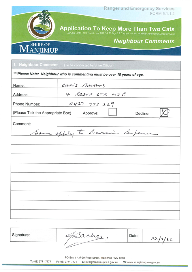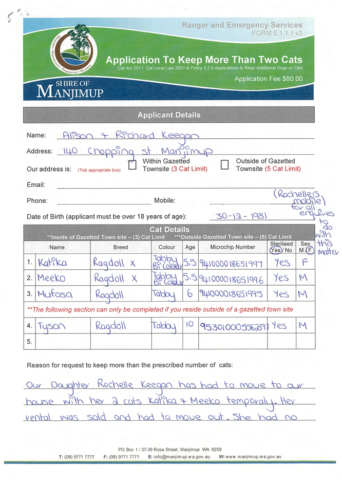 9.7.1 - Application to Keep More Than Two Cats at 140 (Lot 100) Chopping Street, Manjimup